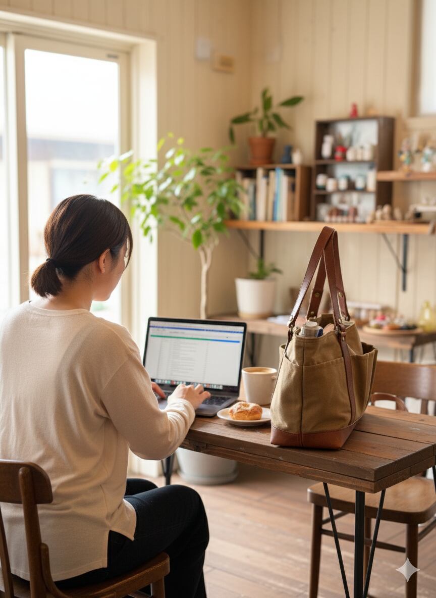 サイズ的には写真のようにA4サイズのノートがスッと入る大きさで、出勤用にもお出かけ用にもお使いいただけます。