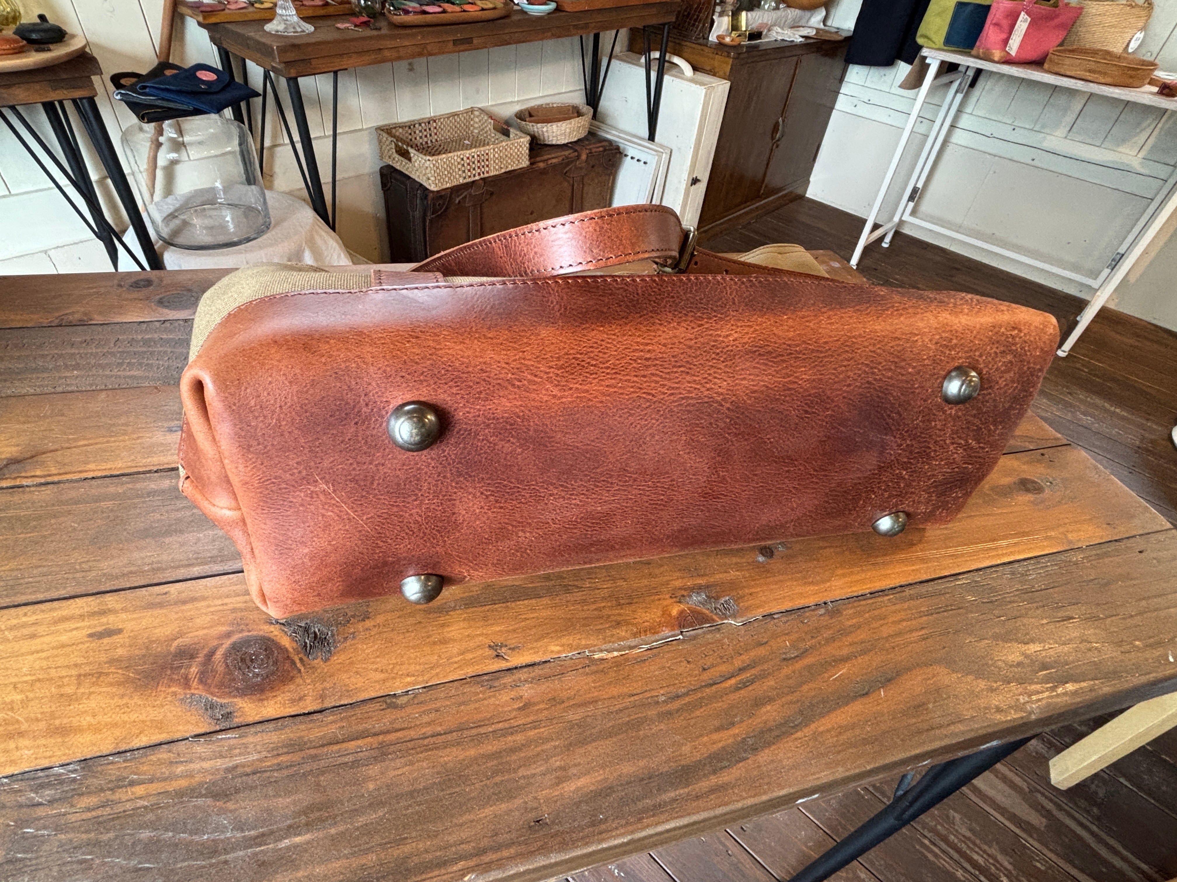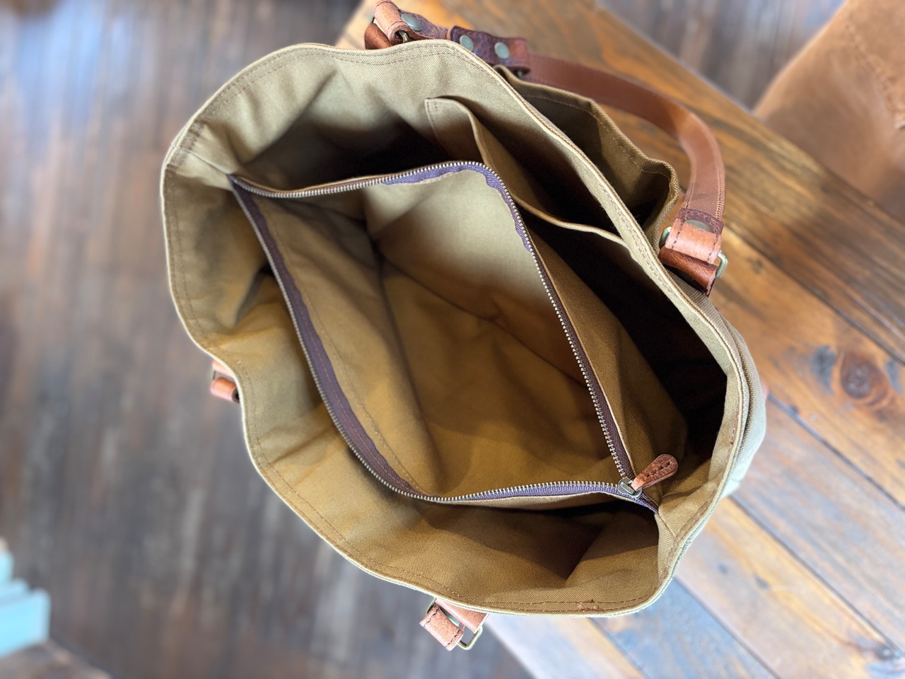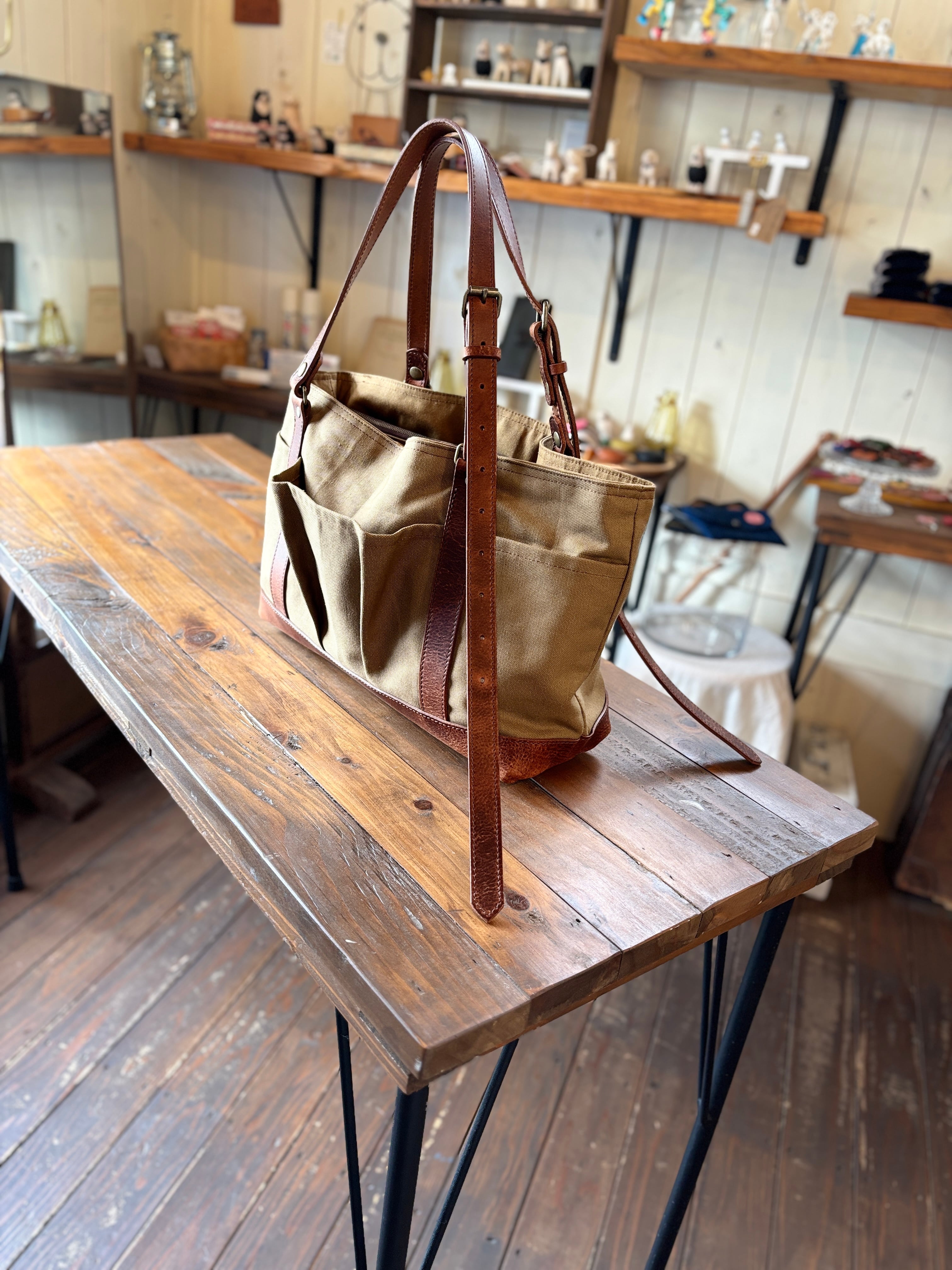 本体はブラウンとカーキの間ぐらいの色合いの帆布を使用し