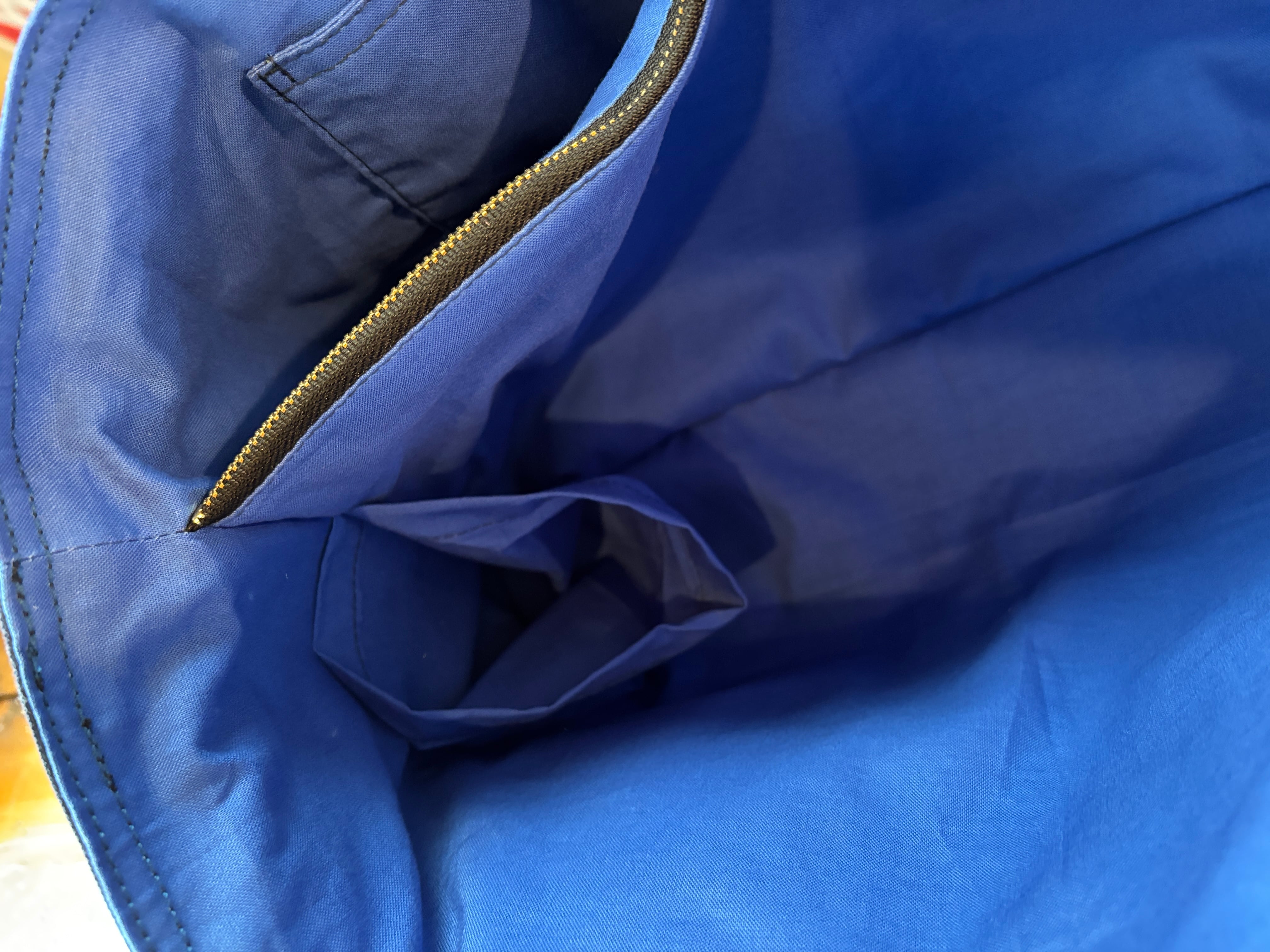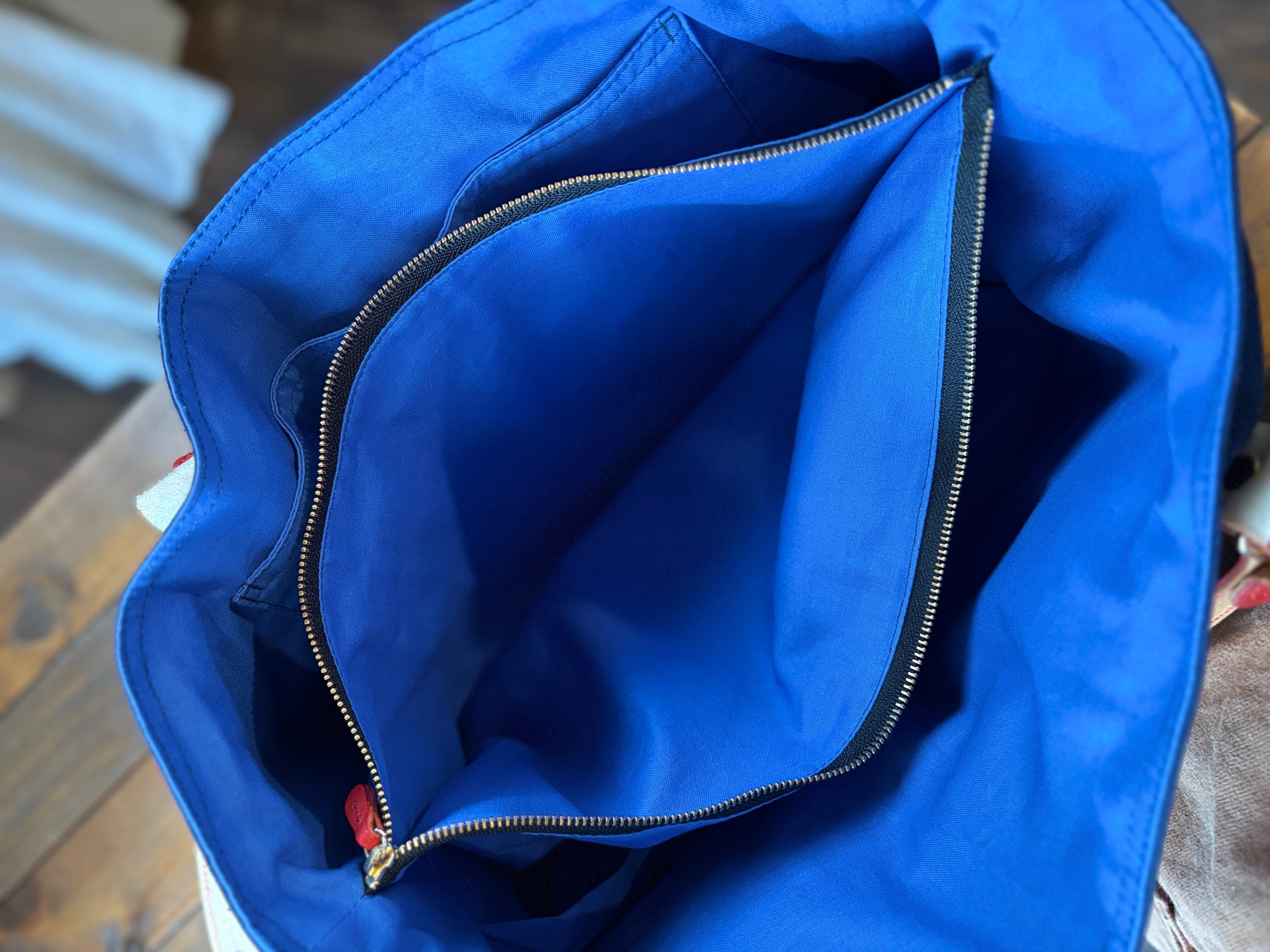 本体はネイビーを使用し内側にはパッと目を引く鮮やかなコバルトの布を使用しています。
