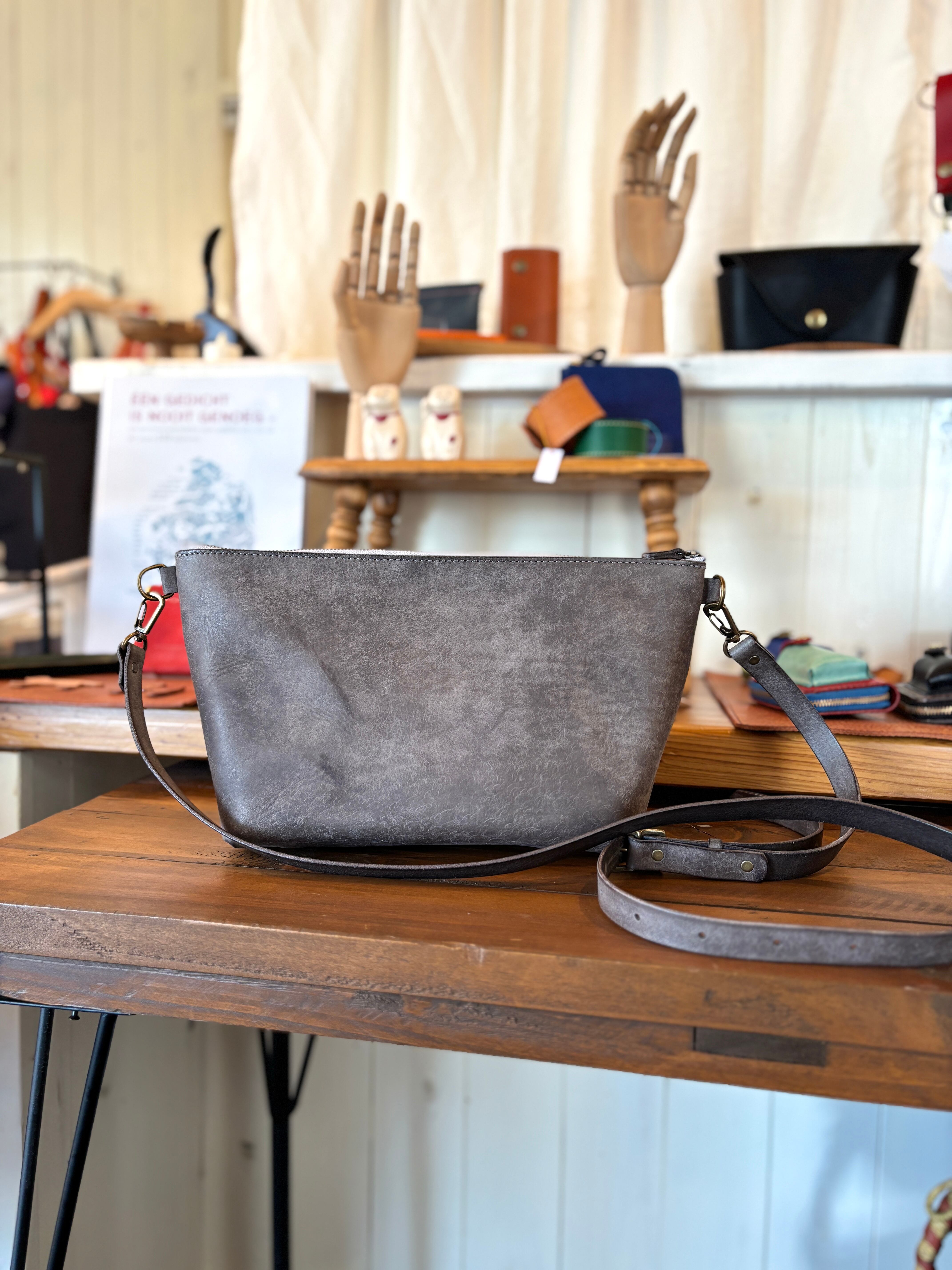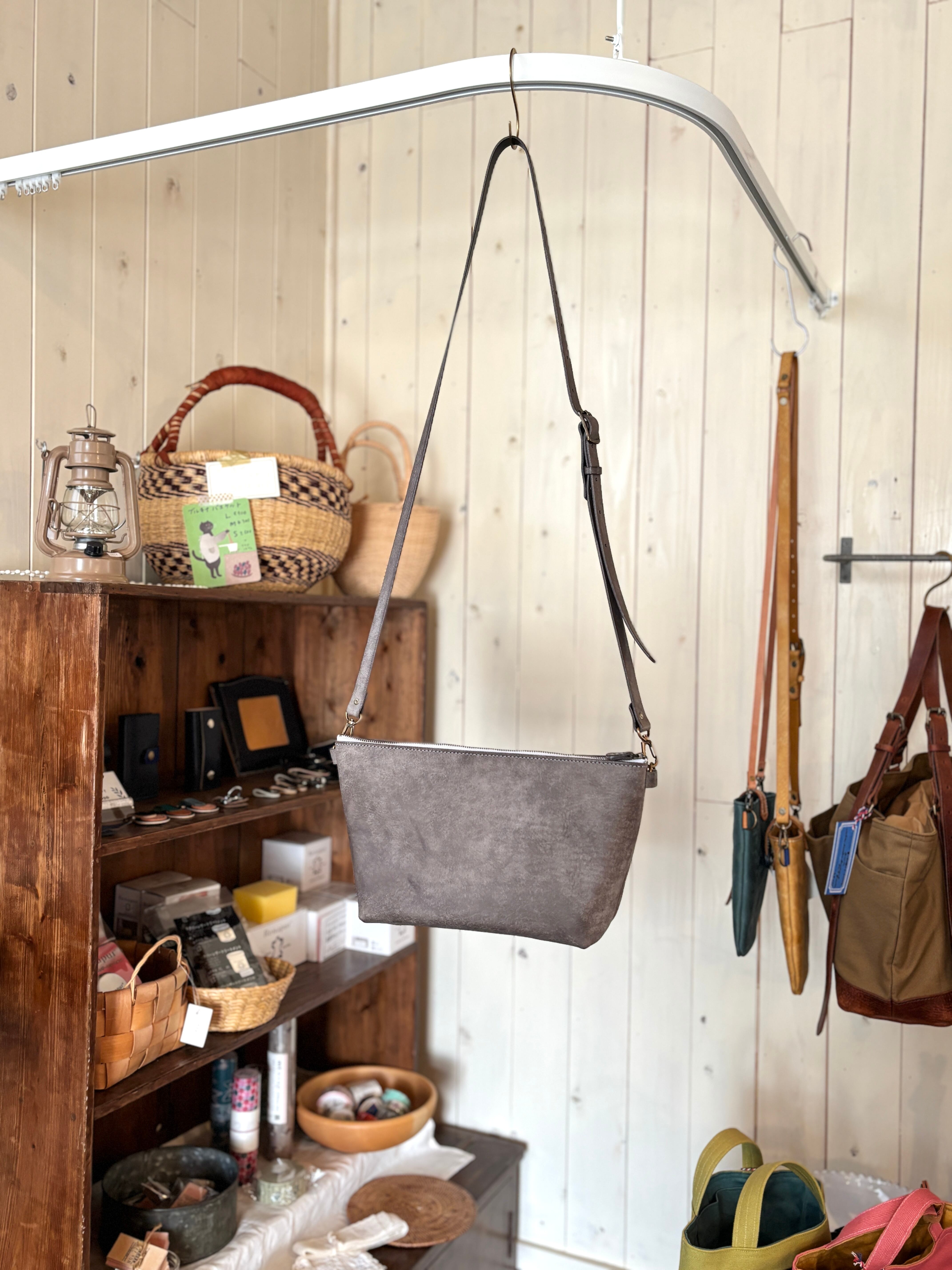 マチ広めのシンプルショルダーバッグ グレー イタリアンレザー/ 長財布収納・大容量・調節ショルダー