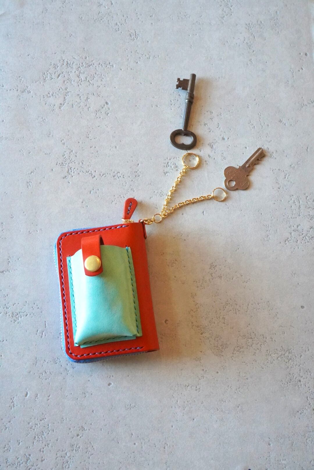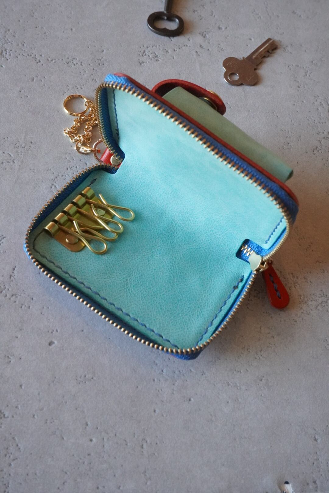 高品質なイタリアのレザーを使用し、艶やかな赤色と優しい水色で可愛く機能的なラウンドファスナーのキーケースを作りました。