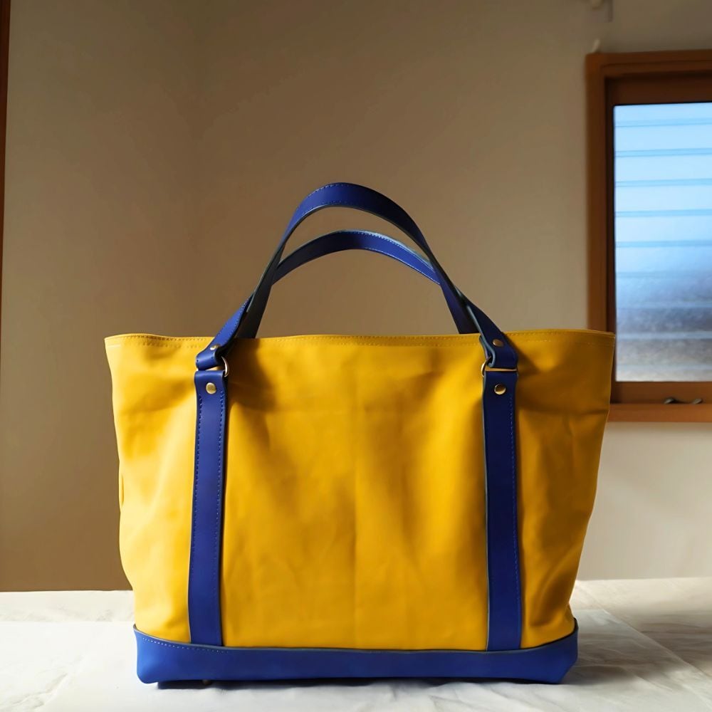 上質な国産レザーコバルトブルーと鮮やかなイエロー帆布を使用した、シンプルながら機能性に優れたトートバッグです。デイリー使いからお仕事まで、あらゆるシーンで大活躍!
